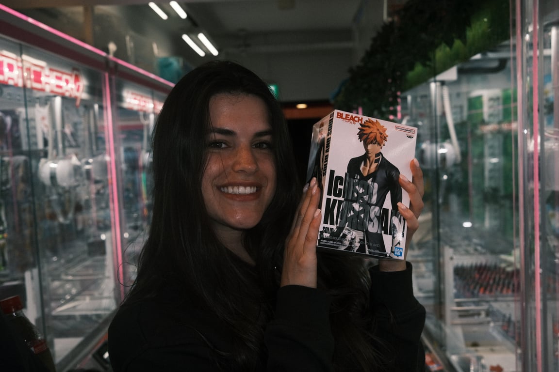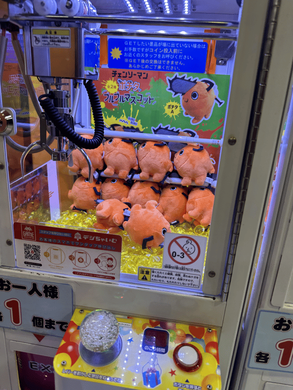 Rachel made another appearance. She won an [ichigo from bleach](https://en.m.wikipedia.org/wiki/Ichigo_Kurosaki).I was not making any headway with these claw machines and sunk like 3k yen into them ($30). Rachel has been in Akihabara for most of her trip (otaku heaven), and explained that if you spend a bit on the machines and call over an employee, they’ll open the machine and reposition the figurine for you. I needed like six adjustments but I won 2 prizes. A pity based economy works. Also I should not have been using cash. You can load a suica card on your wallet app in your phone. It works to pay for all the subways and claw machines. It’s the double edged sword (katana) of convenience.