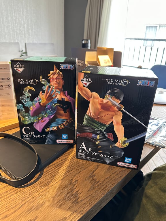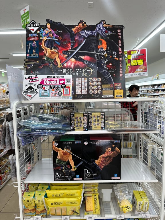 We needed some snacks, so Dylan and I headed to 7-11 while Adrien kept working. In the 7-11 there was a One Piece [Ichiban Kuji](https://onepiece.fandom.com/wiki/Ichiban_Kuji_One_Piece) This is a āguaranteed win lotteryā. The prize pool is displayed on the 7-11 shelves, and you can buy a 700yen ticket which has a category A-I on it. The better the letter the better the prize. If you wanted a specific prize you could basically buy the entire lot to get it. Note: Adriens favorite character is the guy with the pink scars, and we only won the other two. This is how they get you. They eventually did.